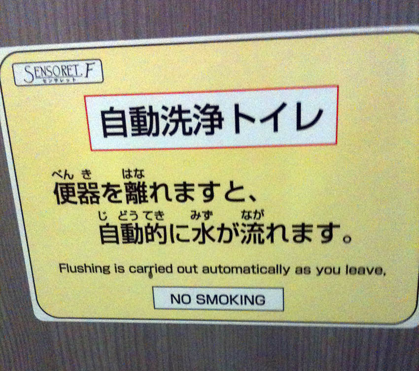 "Flushing will be carried out when you sit down. It will be carried out again when you are having a deeply thoughtful moment, possibly two or three times. It will NOT, however, be carried out as you leave, unless you are having a particularly lucky day, You may as well have that smoke."